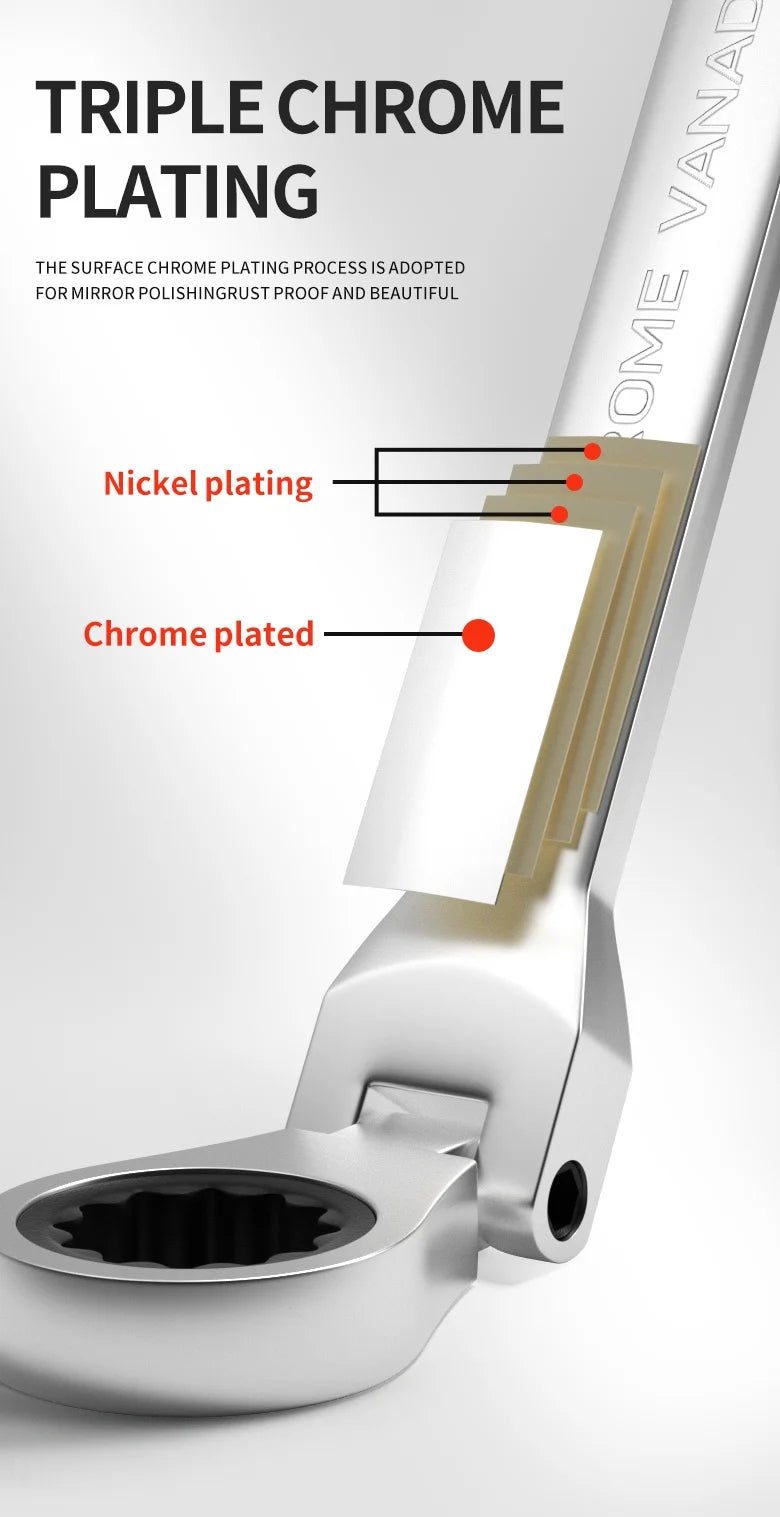 Close-up of the 72-teeth precision ratchet wrench with a chrome finish and ergonomic handle.